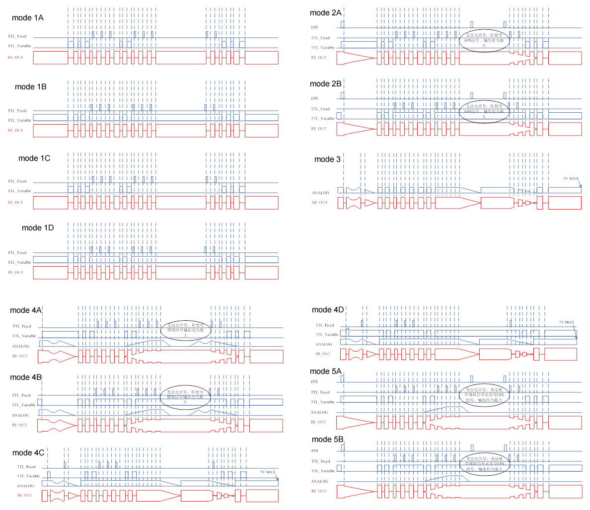 • 模式4A:模数混合模式、上升沿及高电平出光、不出光期射频为最大、出光期射频由ANALOG决定。